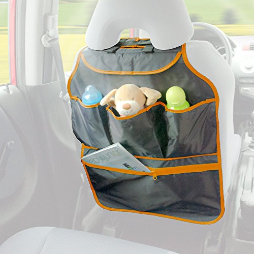 Auto Utensilientasche von Diago Wer mit Kindern unterwegs ist, muss an eine Menge denken: Proviant, Spielzeug, Bücher etc. müssen während der Reise stets griffbereit sein. In der DIAGO Utensilientasche lässt sich alles platzsparend verstauen und ist jederzeit parat für Ihre Kinder. Die Utensilientasche enthält: 1 kleine Tasche mit Klettverschluss verschließbar, z.B. für Stifte 3 geräumige Taschen mit Klettverschluss verschließbar - für Kinder leicht zu öffnen - z.B. für Trinkflasche, kleines Spielzeug etc. 1 große Tasche mit Reißverschluss verschließbar, z.B. für Bücher, Zeitschriften, Spielzeug. Die Autositztasche ist mit einer Größe von 73 x 48 cm so bemessen, dass sie bei den meisten Autositzen die gesamte Rückfläche einnimmt und somit den Vordersitz auch vor Schmutz schützt. Befestigen Sie die Tasche mit der Klettverschlussbefestigung an der Kopfstütze des Vordersitzes, dann hat Ihr Kind stets Zugriff auf seine Sachen. Das schlichte Design mit farbigen Akzenten passt zu jedem Auto.Zur Aufbewahrung von Spielzeug, Proviant, Bücher etc.