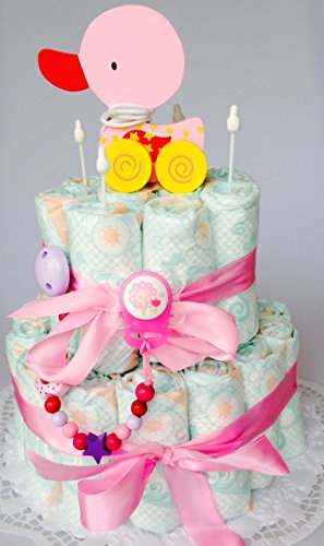 Liebevoll von Hand gearbeitete Windeltorte mit Hinterherziehentchen als Spielzeug. Vor dem Versand packen wir Ihnen die Torte selbstverständlich noch in Folie ein, mit passender Schleife - fertig zum Verschenken!!! Auf Wunsch bringen wir kostenlos auch den Namen des Babys an. Bitte geben Sie den Namen in einer Mail nach der Bestellung an. Der Hingucker auf Taufen, Babypartys und zum Besuch bei den frisch gebackenen Eltern. Wunderschönes Geschenk zur Geburt, zur Taufe und zum Babyshower. Bei der Gestaltung unserer Windeltorten verwenden wir kein Klebeband, damit die Windeln unbeschädigt verwendet werden können. Jede Windeltorte wird bei uns einzeln von Hand gestaltet und ist so immer ein Unikat! BITTE beachten: Teilen Sie uns den gewünschten Namen einfach nach dem Bestellvorgang in einer separaten Email an info@elfenstall.de mit!Das ideale Geschenk zur Geburt , Taufe oder Babyshower