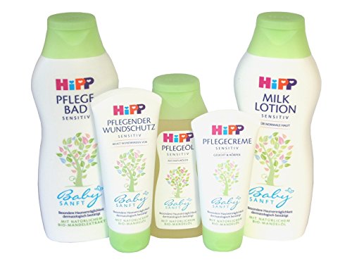 HiPP Pflege - SET 1 Flasche HiPP Pflege-Öl 200 ml 1 Tube HiPP Pflege-Creme 75 ml 1 Tube HiPP Wundschutz-Creme 100 ml 1 Flasche HiPP Milk-Lotion 350 ml 1 Flasche HiPP Pflege-Bad 350 ml Produktinformationen Alle Produkte enthalten natürliches Bio-Mandelöl ohne Mineralöl um Allergie-Risiken zu minimieren ohne allergieverdächtige Duftstoffe ohne Farb-und Konservierungsstoffe ohne tierische Rohstoffe ohne ätherische Öle ohne PEG-Emulgatoren ohne ParabenePflegebad